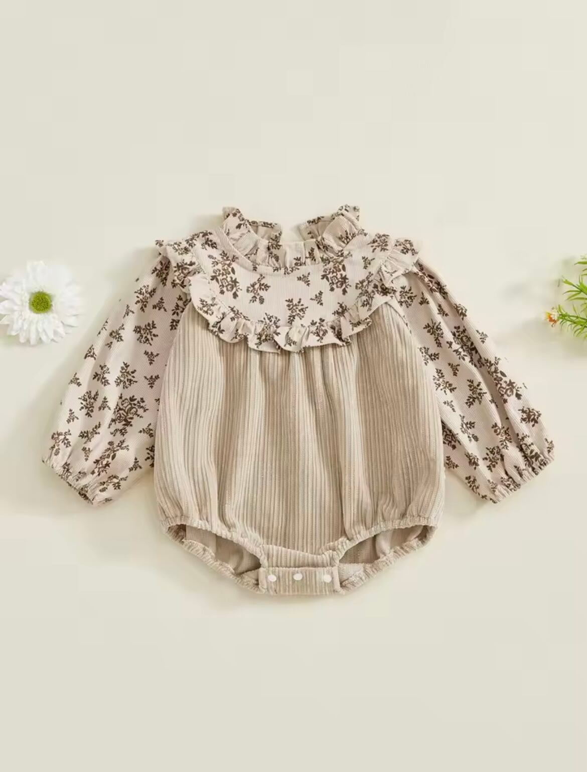花柄モックネックフリルロンパース