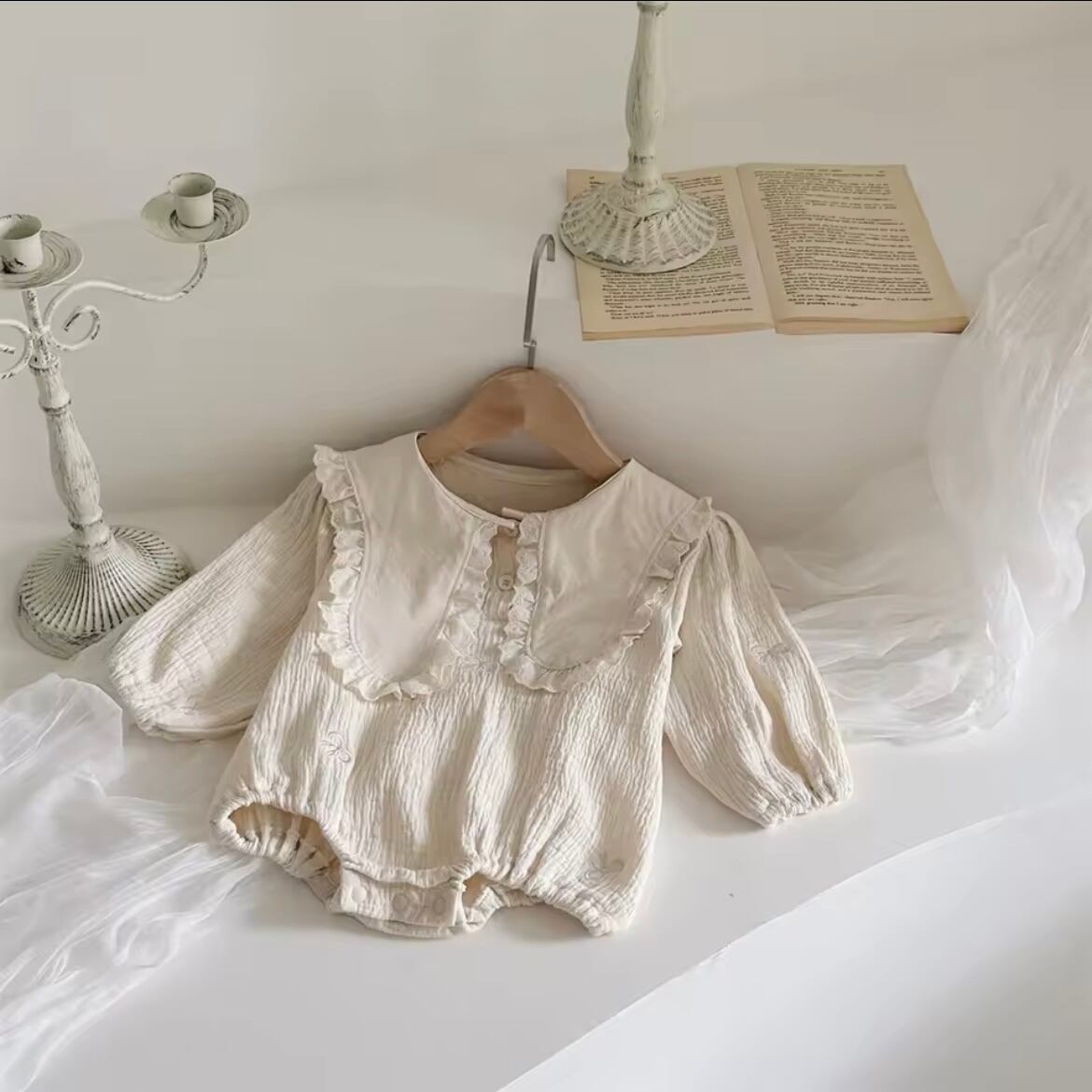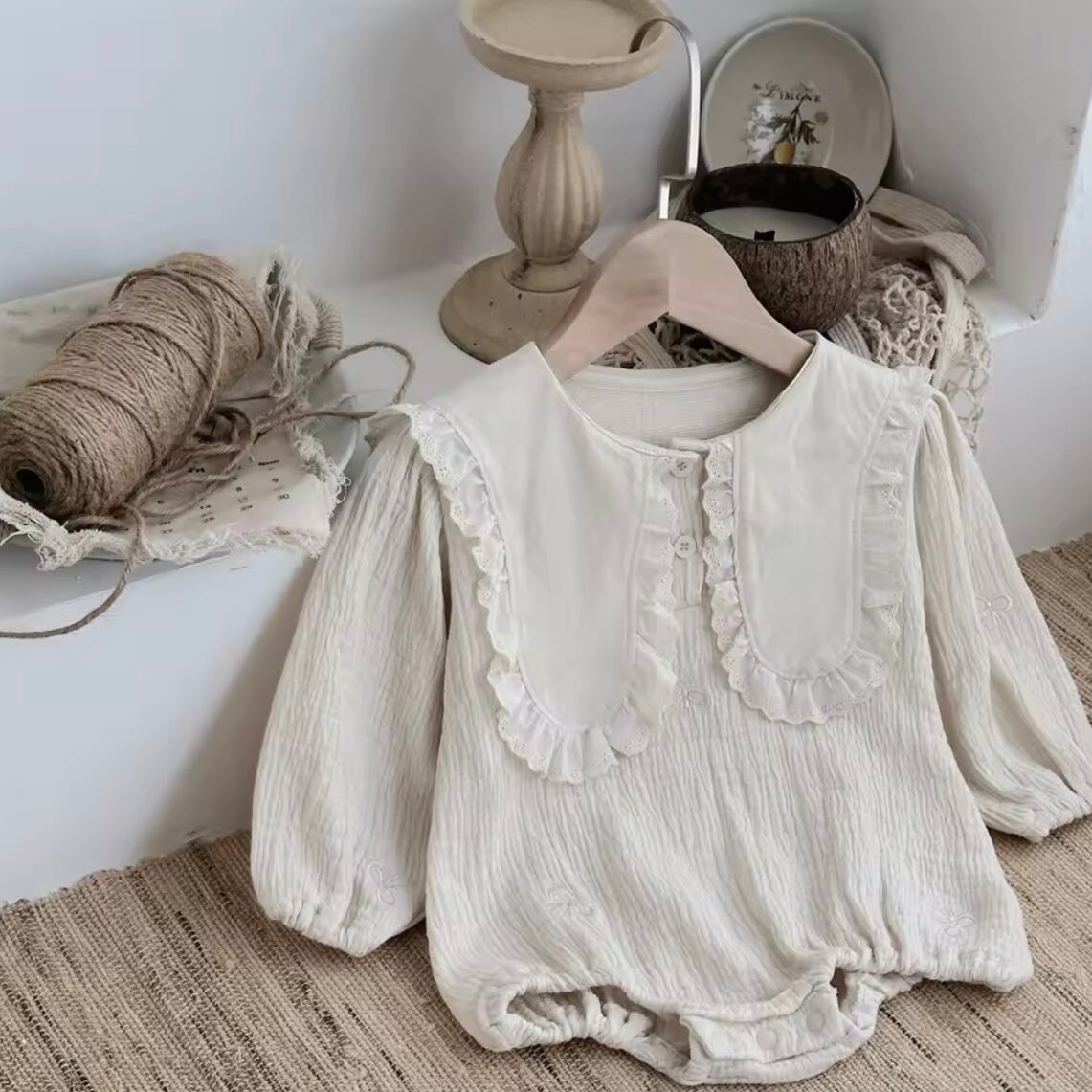 「フリルカラーロンパース」は、柔らかなフリルカラーが可愛らしさを引き立てる一着です♡ 優れた素材を使用しており、赤ちゃんのデリケートな肌にも優しい着心地を提供します◎ 日常使いや特別なお出かけにもぴったりなアイテムです!