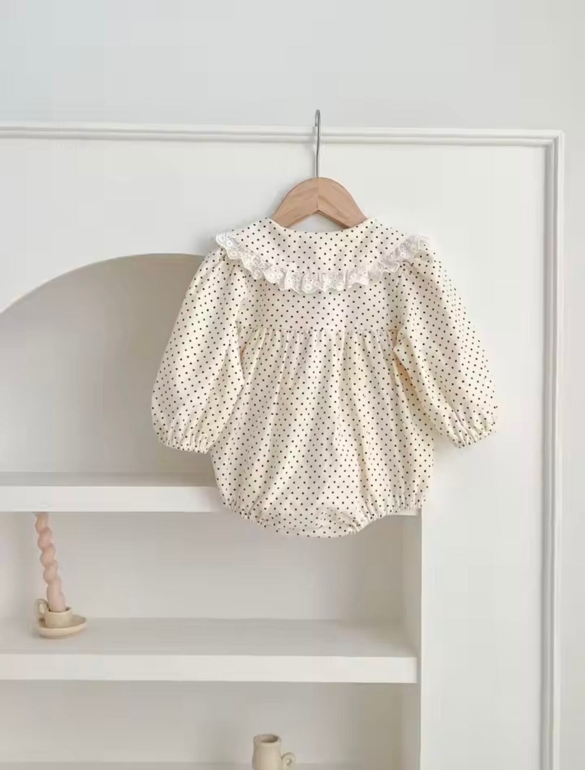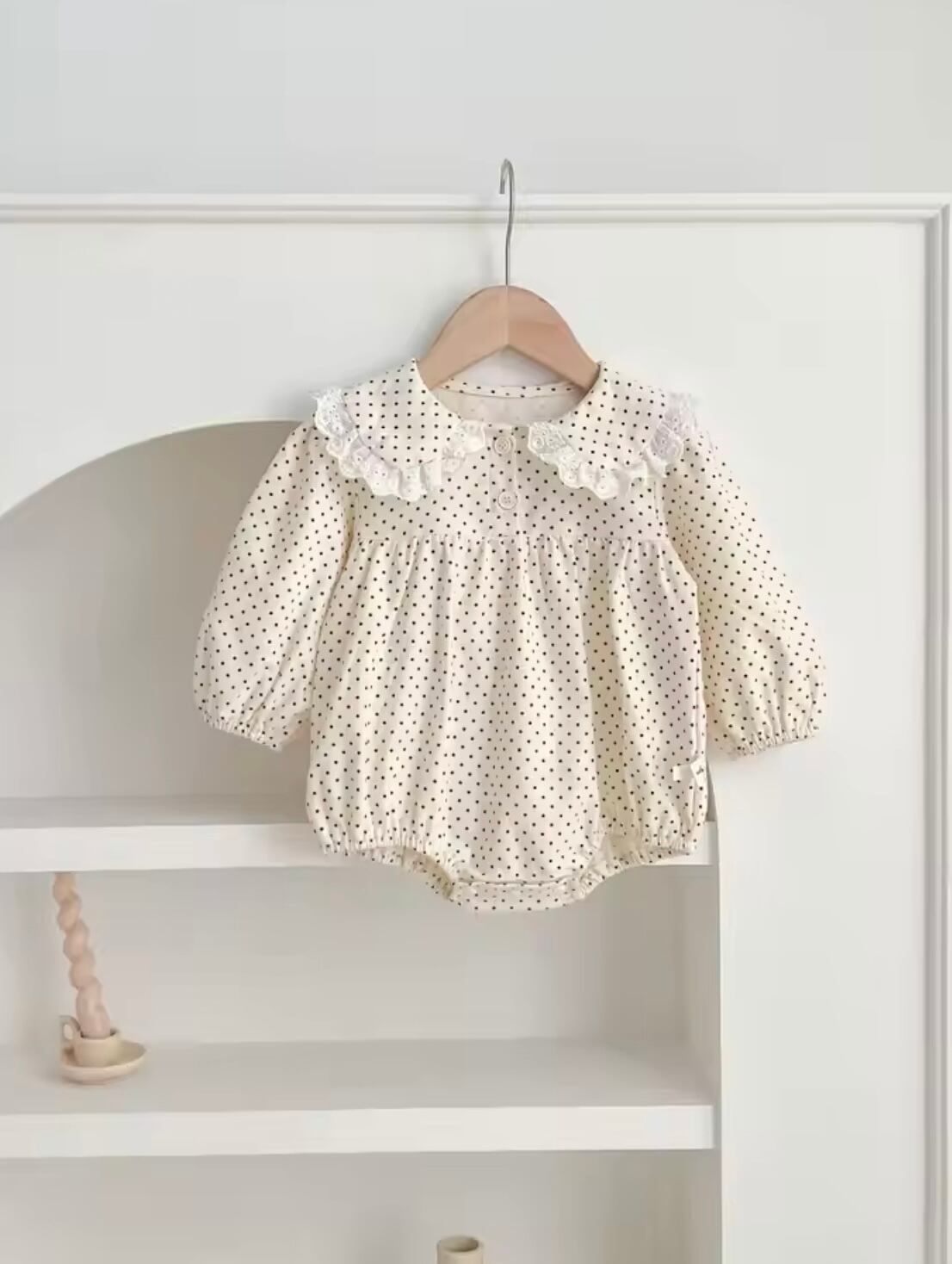 「レースカラードットロンパース」は、かわいらしいドット柄とエレガントなレースカラーが特徴のアイテムです♡ スタイリッシュながらも着心地が良く、お出かけや特別なイベントにもぴったりな一枚です◎